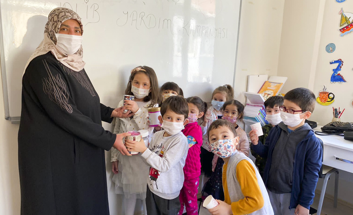 4-6 yaş gurubu Kur'an kursu öğrencileri, kampanyaya destek olmak için kumbaralarını Kur’an Kursu Öğreticisi Hatice Gerek öncülüğünde TDV Eskişehir Şubesine teslim ettiler.