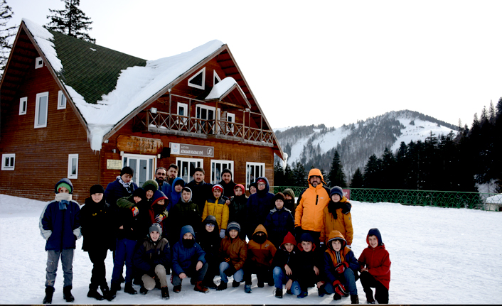Merkez Hafızlık Kuran Kursu ve Artvin İl Özel İdaresine ait bir otelde konaklayan öğrenciler, kampın ikinci gününde, kızak ve şambreller ile kayıp kartopu oynadı.