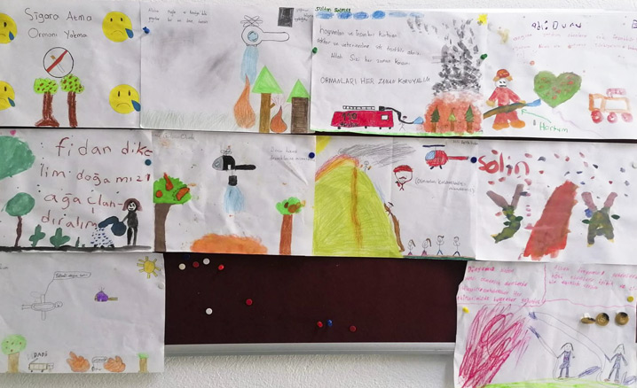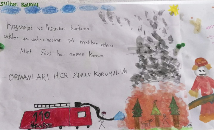 Resimlerde orman yangınlarını ve yangınlara karşı sürdürülen mücadeleyi anlatan minikler; yangınlara müdahale eden ekiplere, yangınlar nedeniyle yaralanan veya zarar gören vatandaşlara yardıma koşan doktorlara ve yangınlarda yaralanan hayvanları tedavi eden veterinerlere teşekkür ettiler.
