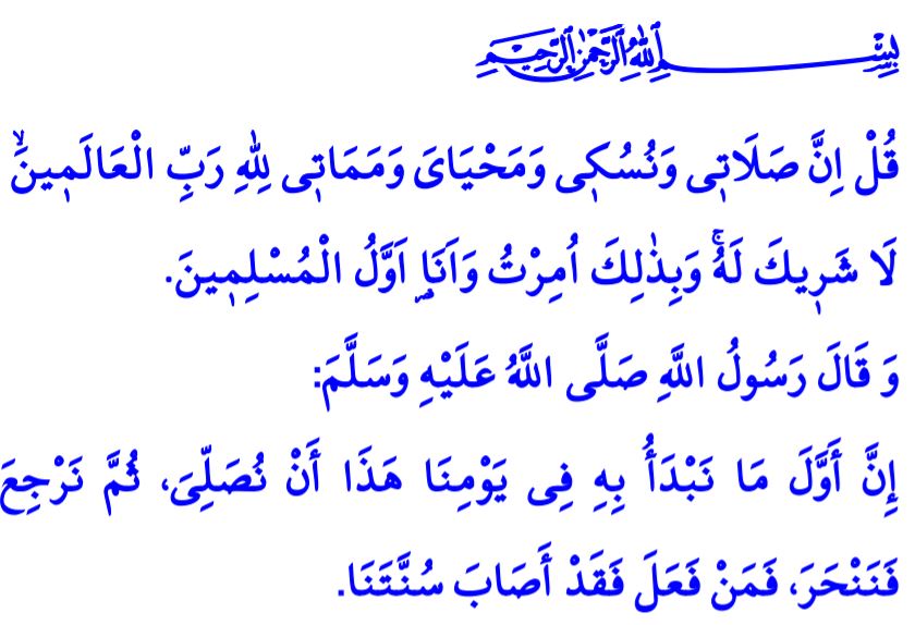 “Ben hakka yönelen birisi olarak yüzümü, gökleri ve yeri yaratan Allah’a çevirdim. Ben Allah'a ortak koşanlardan değilim. Şüphesiz benim namazım, kurbanım, hayatım ve ölümüm âlemlerin Rabbi olan Allah içindir. O’nun hiçbir ortağı yoktur. Ben bununla emrolundum ve ben Müslümanların ilkiyim.”[4]