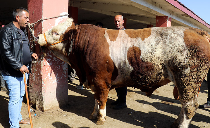 Batı illerine kurban sevki için de hazırlıkların yapıldığı pazarda, ağırlıkları bir tona yakın olan simental cinsi boğalar, ortak kurbanlık almak isteyenlerin ilgisini çekiyor.
