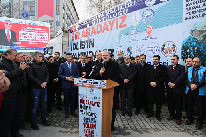 Türkiye’nin barış, huzur ve merhamet toprakları olduğuna vurgu yapan Vali Dr. Ömer Toraman, “Biz bu topraklar üzerinde yaşayan aziz bir milletin evlatlarıyız. Bizim medeniyetimizde iyilik tenkit edilmez, takdir edilir, teşvik edilir. İdlib’e gidecek tırlardaki yardım malzemelerinin tamamı Kütahya’daki gönüllü vatandaşlarımız tarafından alındı” dedi. Zulüm ve savaşlarla yurtlarından olmuş kadın, çocuk ve yaşlılara el uzatılması gerektiğini ifade eden Vali Toraman; “ Bir yerde zulüm, yerinden edilmiş insanlar, savaş ve savaştan kaçan kadınlar, çocuklar, yaşlılar var. Onlara uluslararası toplumun el uzatması gerekiyor. Onlar el uzatmıyor diye bizler de mi el uzatmayacağız. Türkiye insani yardım açısından dünyanın önde gelen ülkeleri arasında yer alıyor ve bununla iftihar ediyoruz.” diye konuştu.