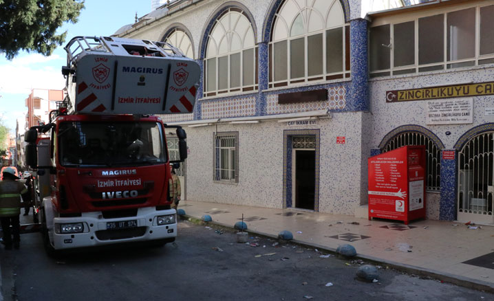 İzmir'in Karabağlar ilçesinde meydana gelen fırtına Çalıkuşu Mahallesi'ndeki Zincirlikuyu Camii'nin minaresinden beton parçalarının düşmesine neden oldu. Olayı görenler durumu polise bildirdi.