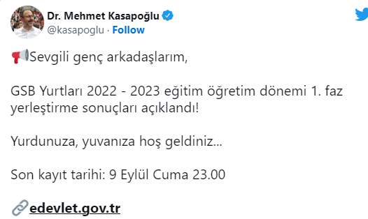 Gençlik ve Spor Bakanı Dr. Mehmet Kasapoğlu sosyal medya hesaplarından yaptığı paylaşımda, 2022 - 2023 eğitim öğretim dönemi 1. faz yerleştirme sonuçları açıkladı.