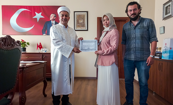 Müftü Bingöl, Kelime-i Şehadet getirerek "Reyhan" ismini alan Eık Shan'e "İhtida Belgesi" ile Kur'an-ı Kerim Meali ve Diyanet İşleri Başkanlığı yayınlarından çeşitli kitaplar hediye etti.