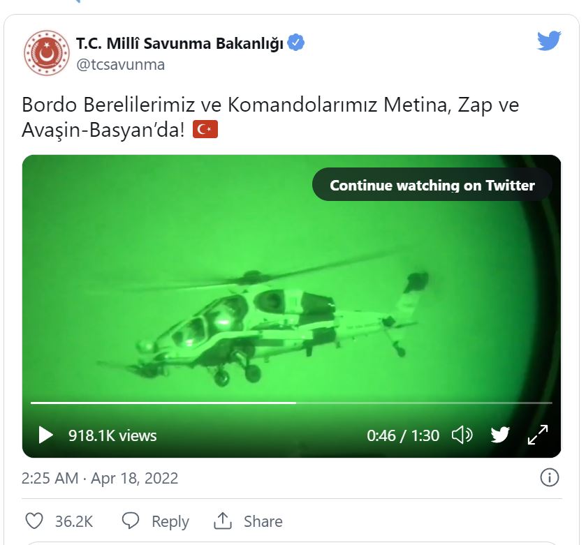 “Hazırlanan plan kapsamında gerçekleştirilen operasyonda Metina, Zap ve Avaşin-Basyan bölgelerindeki terörist hedefleri önce hava kuvvetlerimiz tarafından ateş altına alındı. Kahraman pilotlarımız terör örgütüne ait barınak, sığınak, mağara, tünel, mühimmat depoları ile sözde karargahlardan oluşan hedefleri başarıyla vurdu. Fırtına, ÇNRA ve diğer topçu unsurlarımız tarafından da belirlenen hedefler yoğun şekilde ateş altına alınarak tam isabetle vuruldu. ATAK helikopterlerimiz, İHA ve SİHA'larımızla desteklenen kahraman komandolarımız ve bordo berelilerimiz karadan sızarak ve hava hücum harekatı ile bölgeye intikal etti. Şu ana kadar operasyonumuz planlandığı şekilde başarıyla devam ediyor. Birinci safhada belirlenen hedefler ele geçirildi."