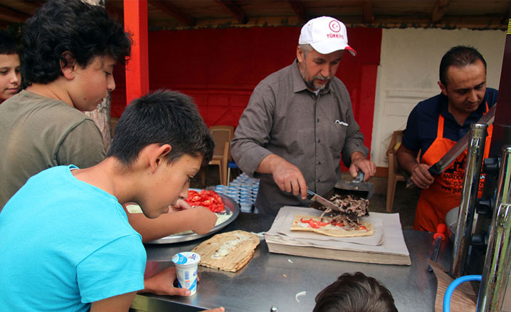 Döner tezgahında kesilen etleri kendi elleriyle paketleyerek çocuklara ikram eden Müezzin Arslan, camiye günlük en az 80 çocuğun geldiğini, zaman zaman sayının 180'e kadar çıktığını söyledi.