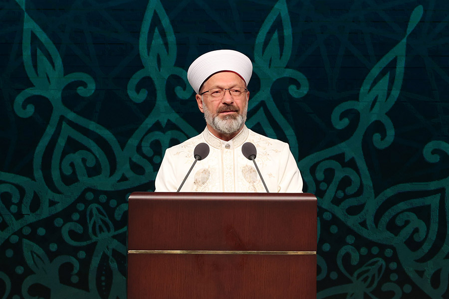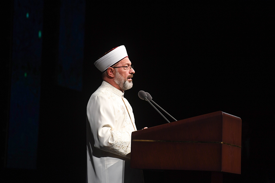 Başkan Erbaş, "Bu gece, Yüce Rabb'imizin insanlığa en büyük ikramı olan Resul-i Ekrem Efendimizin yeryüzünü teşrif ettiği gecedir. Bu gece, karanlıkların çepeçevre kuşattığı insanlığın ufkuna, ilahi rahmetin bir güneş gibi doğduğu gecedir. Bu gece sevinç, bu gece sürur, bu gece muhabbet gecesidir. Bu gece umut, bu gece şükür, bu gece rahmet gecesidir." diye konuştu.
