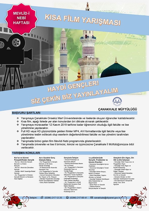 Çanakkale Müftülüğü 2018 Yılı Mevlid-i Nebi Haftası etkinlikleri kapsamında kısa film yarışması düzenleyecek.