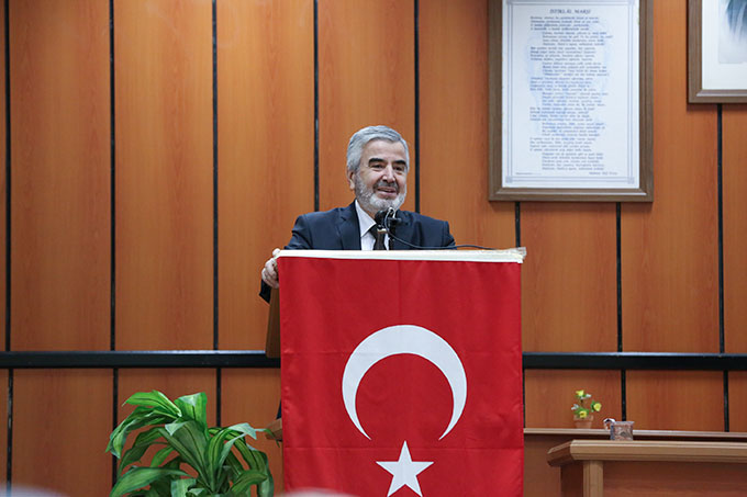 “Dinin bize kazandırdığı değerler aslında bizim medeniyet ve kültür değerlerimizi de oluştururlar. Mesela bizim en önemli simgelerimizden birisi bayrağımızdır. Bizim milli simgemizdir. Bayrağın simge olan tarafları dini kültürümüzden beslenmekte ve dini alt yapıyla gelişmektedir. Bayrağımızdaki hilal ve yıldız kelime-i tevhidin özü ve özetidir. Hilal kelimesi, Allah kelimesiyle aynı harflerden oluşmaktadır. Hatta “lale” kelimesinde de aynı harfler vardır. O yüzden süslemede Allah lafzını “lale” olarak sembolize ederiz. Bayrağımıza Allah adını, hilal remziyle sembolize ederiz. Maksadımız ve amacımız, kelime-i tevhidin Allah lafzıyla ifade edilmesidir. Beş köşeli yıldızımız, Muhammed adının Arapça yazılışı ve sembolüdür. Dolayısıyla hilal ve yıldız dini menşeiden kaynaklanmış, sembol olmuş âlemlerdir.