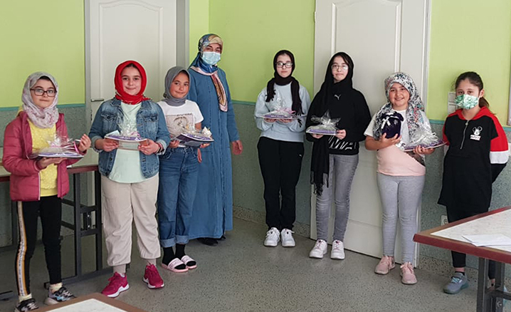 Din görevlisi Abdullah Kandemir ve kadınlar kolu başkanı Nurgül Özhan, güne özel öğrencilere kitap ve çiçek hediye vererek mukabelede bulundu.