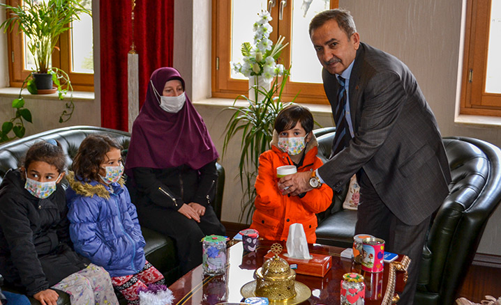 Kur'an kursu öğreticileri rehberliğinde İl Müftülüğünü ziyaret eden minikler, kumbaralarında biriktirdikleri harçlıklarını Suriye'deki kardeşlerine ulaştırılmak üzere İl Müftüsü ve Türkiye Diyanet Vakfı (TDV) Kırıkkale Şubesi Başkanı Hasan Hayri Yaşar'a teslim etti.
