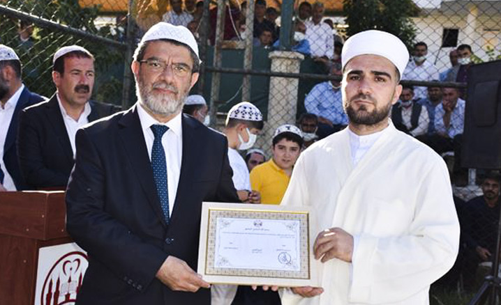 Kur’an Kursu Halı Sahası’nda düzenlenen merasim Kur'an-ı Kerim tilavetiyle başladı, ilahi ve kasidelerin seslendirilmesiyle devam etti.