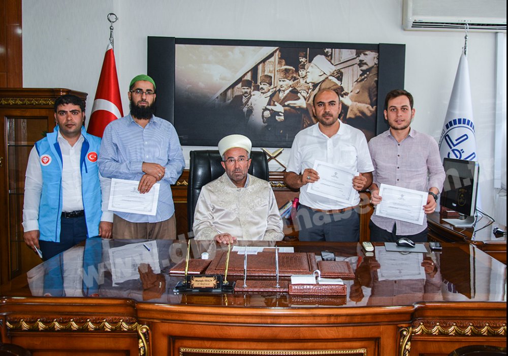 Iğdır TDV Şube Temsilcisi Ömer Kaya tarafından kampanya bağış makbuzu, İl Müftüsü Tekin ve din görevlilerine takdim edildi.