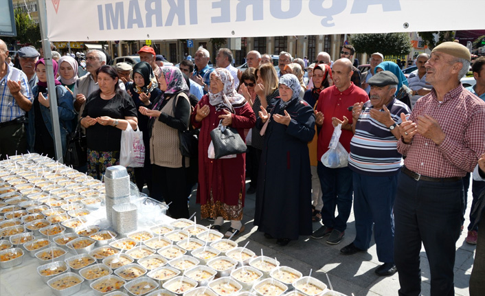 Çorum’un simgesi olan saat kulesi yanındaki Hürriyet Meydanı’nda Muharrem ayı vesilesiyle bir araya gelen vatandaşlara, aşure ikram edildi.