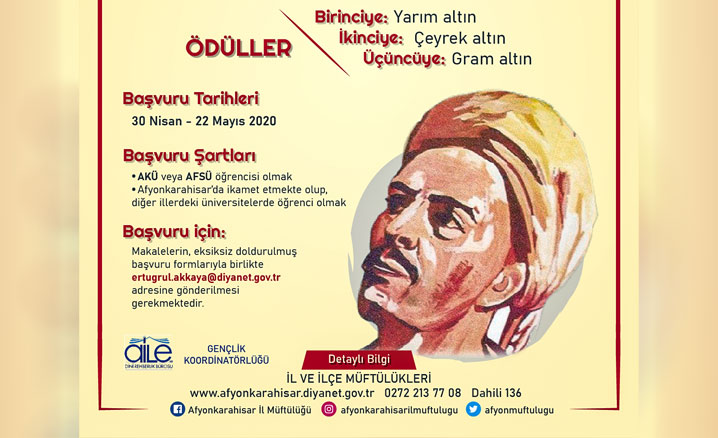 Afyonkarahisar Müftülüğünce, virüsle mücadele sürecinde üniversite öğrencilerine rehberlik etmek ve manevi destek sağlamak amacıyla; "Yunus Emre’nin Sevgi ve Hoşgörü Anlayışı" konulu makale yazma yarışması düzenlendi.