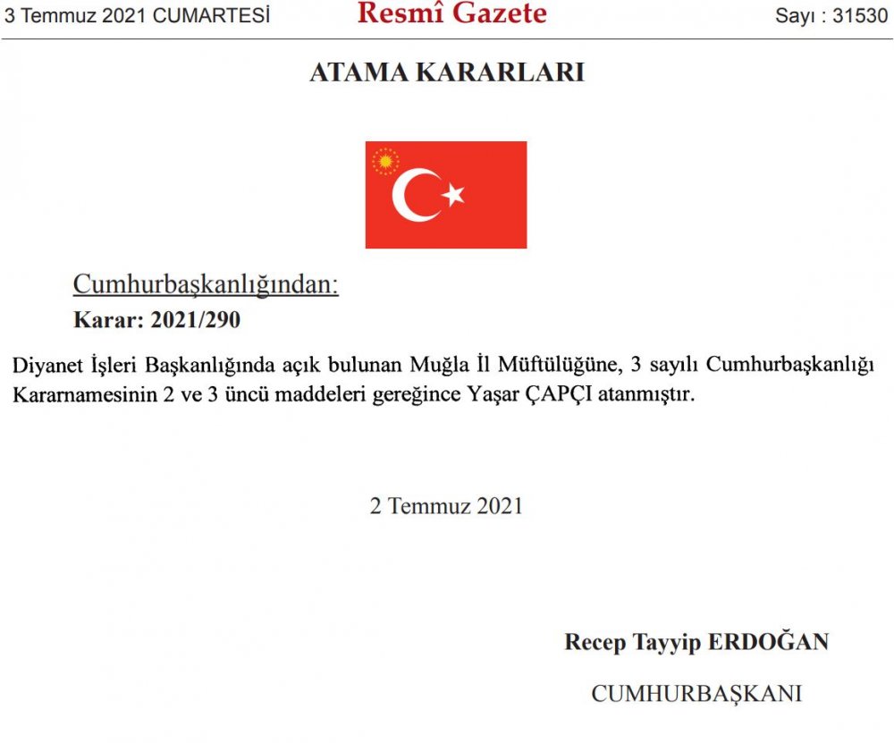 Diyanet İşleri Başkanlığında açık bulunan Muğla İl Müftülüğüne, 3 sayılı Cumhurbaşkanlığı Kararnamesinin 2 ve 3 üncü maddeleri gereğince Yaşar Çapçı atanmıştır.