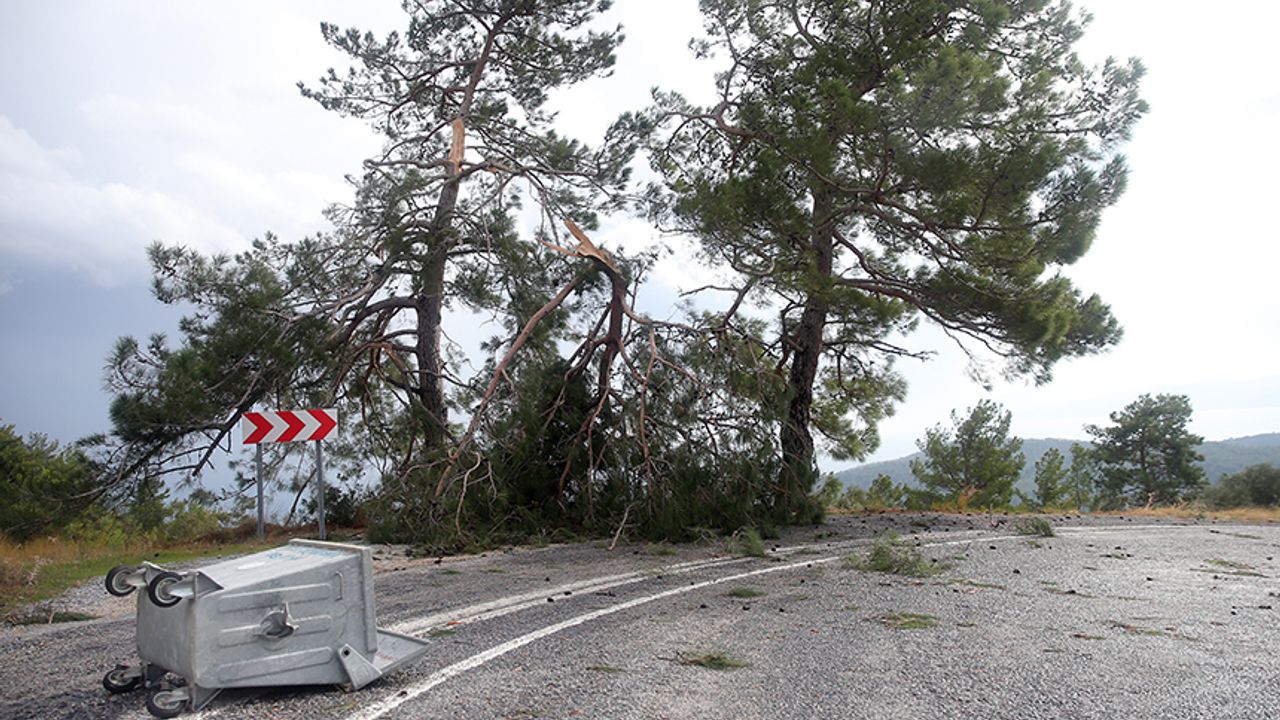 Bölgede etkili olan fırtına nedeniyle Akbük-Muğla kara yolu kenarında bulunan çam ağaçları ve çöp konteynerleri de devrildi.