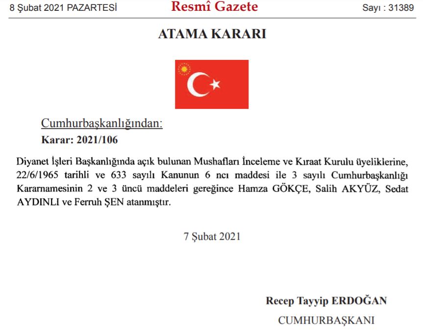 Diyanet İşleri Başkanlığında açık bulunan Mushafları İnceleme ve Kıraat Kurulu üyeliklerine, 22/6/1965 tarihli ve 633 sayılı Kanunun 6'ncı maddesi ile 3 sayılı Cumhurbaşkanlığı Kararanamesinin 2 ve 3 üncü maddeleri gereğince Hamza Gökçe, Salih Akyüz, Sedat Aydınlı ve Feruuh Şen atanmıştır.