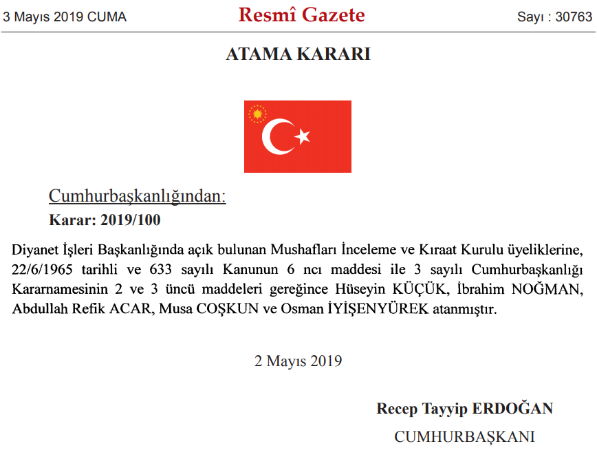 Mushafları İnceleme ve Kıraat Kurulunda açık bulunan üyeliklere atama yapıldı.