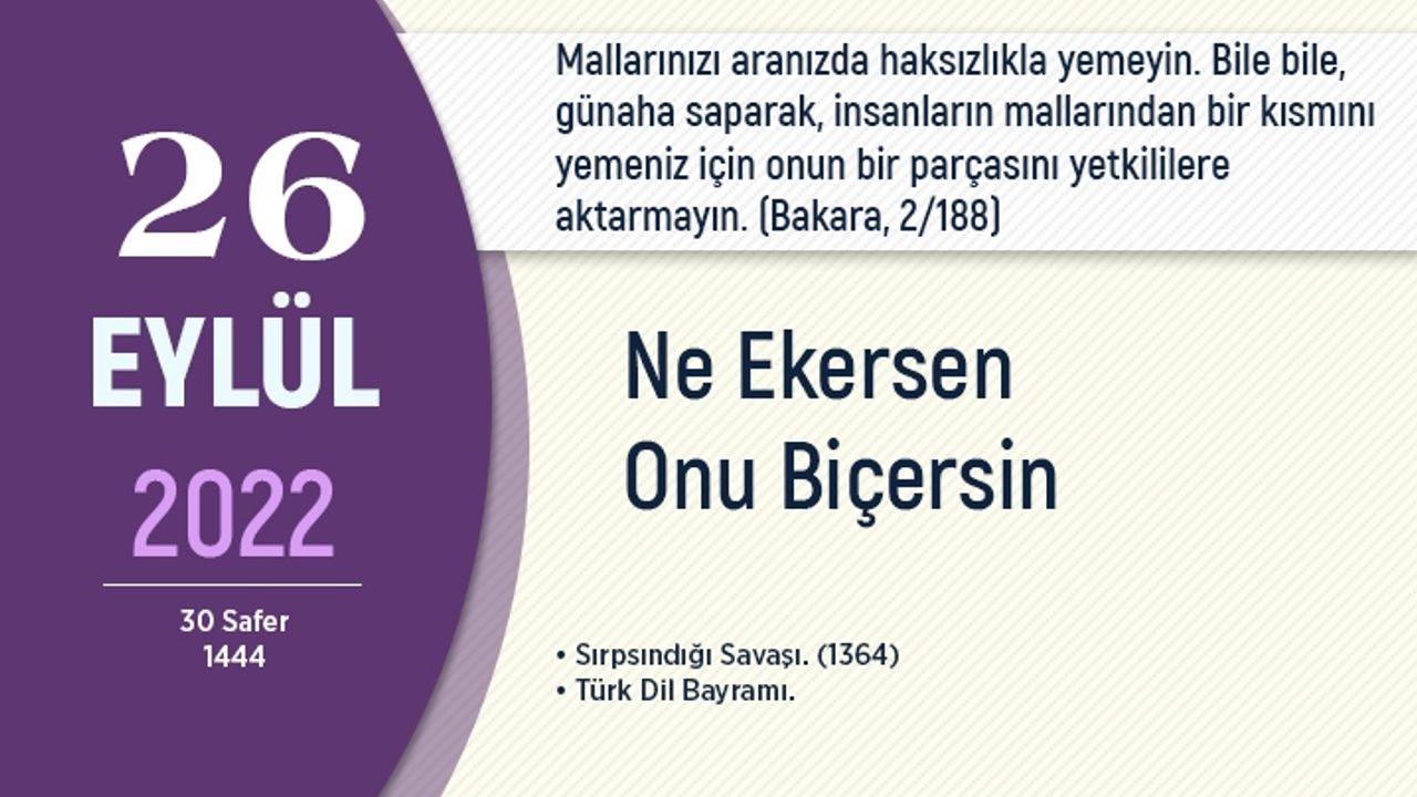 Atalarımız, yaptığımız davranışların zamanla bize döneceğini hatırlatır: “Ne ekersen onu biçersin.”, “Ne doğrarsan aşına o gelir kaşığına.”, “Herkes ne ederse kendine eder.” Ekilen her tohum kendi fidanıyla boy gösterir. Büyür, meyve verir. Elma fidanı armut ağacına dönüşmez. “Men dakka dukka.” eden bulur anlamında bir Arap atasözü olarak bizim kültürümüzde de sıkça kullanılır. İnancımız, zerre kadar da olsa her hareketin mutlaka hesabının verileceğini bildirir. Hayır ya da şer, her davranışın bir faturası olacaktır.
