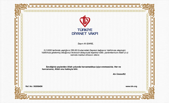 İlçe Müftüsü Yalman, Türkiye Diyanet Vakfının Elazığ ve Malatya’da depremzedeler için başlatmış olduğu yardım kampanyası kapsamında açılan bağış hesabına 250 TL’yi Ali İdare’nin adına yatırdı.