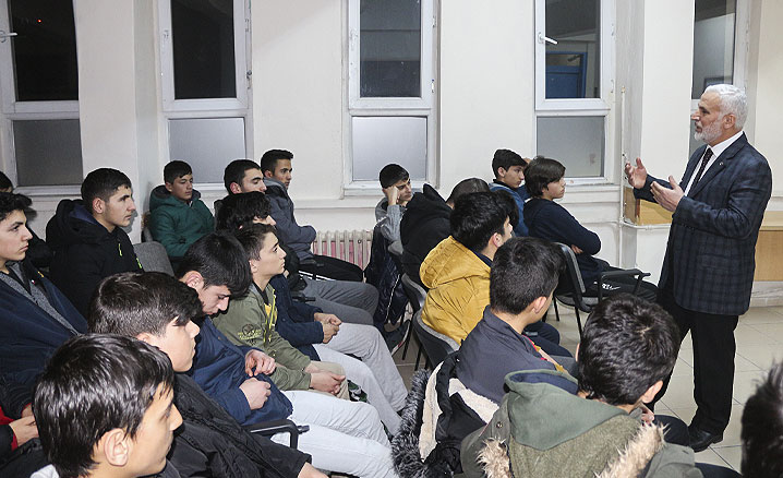 Ağrı Hüseyin Celal Yardımcı Fen Lisesi’nde öğrencilerle buluşan Ağrı İl Müftüsü Tandoğan Topçu, “Allah’tan Hakkıyla Hayâ Etmek” konulu konferans verdi.