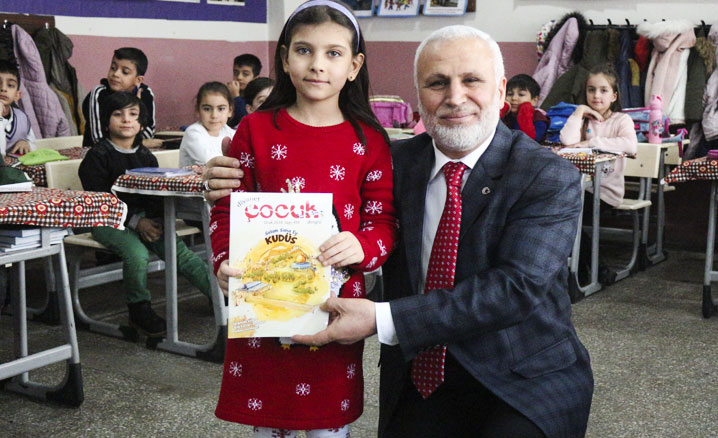 Okul idarecileriyle bir araya gelen Müftü Topçu, sınıfları ziyaret ederek öğrencilere Diyanet İşleri Başkanlığınca çocuklara özel hazırlanan “Diyanet Çocuk Takvimi” ve “Diyanet Çocuk Dergisi” hediye etti.