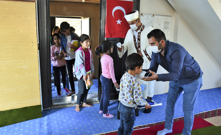 Cami girişinde çocukların ateşini ölçüp maskelerini kontrol ediyor, ellerini dezenfekte ettirerek camiye girişlerine izin veriyor.