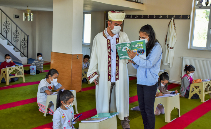 Yüz yüze eğitime başlayamayan ve haftanın belirli günlerinde EBA üzerinden eğitim gçren öğrenciler için camiyi sınıfa dönüştüren Kertil, çocukları salgından korumak için de Kovid-19 tedbirlerini titizlikle uyguluyor.