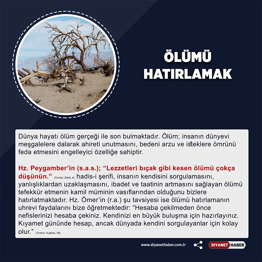 Dünya hayatı ölüm gerçeği ile son bulmaktadır. Ölüm; insanın dünyevi meşgalelere dalarak ahireti unutmasını, bedeni arzu ve isteklere ömrünü feda etmesini engelleyici özelliğe sahiptir. Hz. Peygamber’in (s.a.s.); “Lezzetleri bıçak gibi kesen ölümü çokça düşünün.” (Tirmizî, Zühd, 4) hadis-i şerifi, insanın kendisini sorgulamasını, yanlışlıklardan uzaklaşmasını, ibadet ve taatinin artmasını sağlayan ölümü tefekkür etmenin kamil müminin vasıflarından olduğunu bizlere hatırlatmaktadır. Hz. Ömer’in (r.a.) şu tavsiyesi ise ölümü hatırlamanın uhrevi faydalarını bize öğretmektedir: “Hesaba çekilmeden önce nefislerinizi hesaba çekiniz. Kendinizi en büyük buluşma için hazırlayınız. Kıyamet gününde hesap, ancak dünyada kendini sorgulayanlar için kolay olur.” (Tirmizî, Kıyâme, 25)