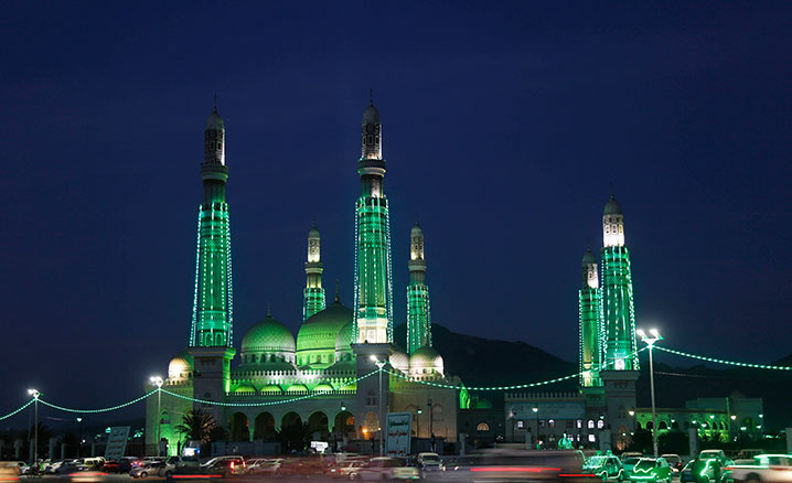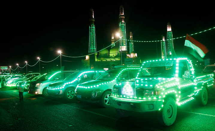 Yemenliler Mevlid Kandili kutlamasında yeşil ışıklarla süslenen araçlarıyla konvoy oluşturdu.