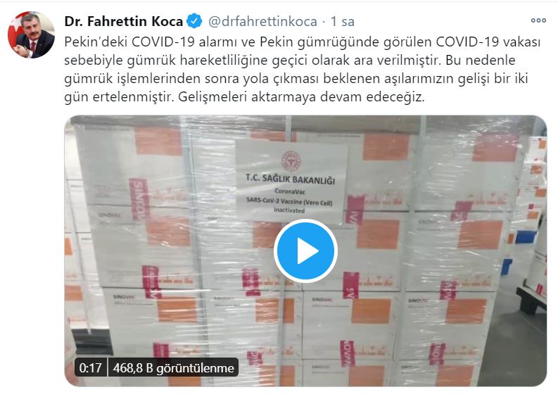 Bakan Koca, Twitter'dan Çin'den gelecek Kovid-19 aşılarına ilişkin yaptığı açıklamada, "Pekin'deki Kovid-19 alarmı ve Pekin gümrüğünde görülen Kovid-19 vakası sebebiyle gümrük hareketliliğine geçici olarak ara verilmiştir. Bu nedenle gümrük işlemlerinden sonra yola çıkması beklenen aşılarımızın gelişi bir iki gün ertelenmiştir. Gelişmeleri aktarmaya devam edeceğiz." ifadelerini kullandı.