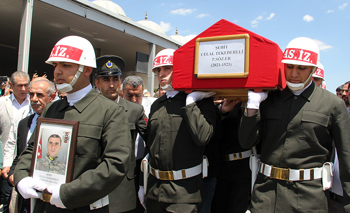 Namazın ardından askerlerin omzuna alınan şehit Celal Tekedereli'nin naaşı, top arabasında taşınarak şehitlikte defnedildi.