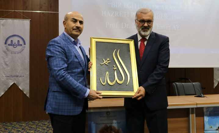 Ardından "Hz. Peygamber En Güzel Muallim ve Mürebbi" konulu konferansta konuşan Prof. Dr. Mehmet Emin Ay, "Diyanet İşleri Başkanlığı her yıl bir tema belirleyerek o yüce Resûlu, insanların tanımasına vesile olmaktadır. Bir insanı tanımadan sevmek, sevmeden onu derinlemesine anlatabilmek mümkün olmaz. Peygamber Efendimizi tanımak ve onu en güzel bir şekilde anlamak gibi bir görevimiz var, ümmeti olarak. Dünyanın dört bir yanında İslam medeniyetinden bahsedebiliyorsak eğer, yaşayan bir zihnin onu yaşayan ve yaşatan Peygamber sayesindedir." diye konuştu.