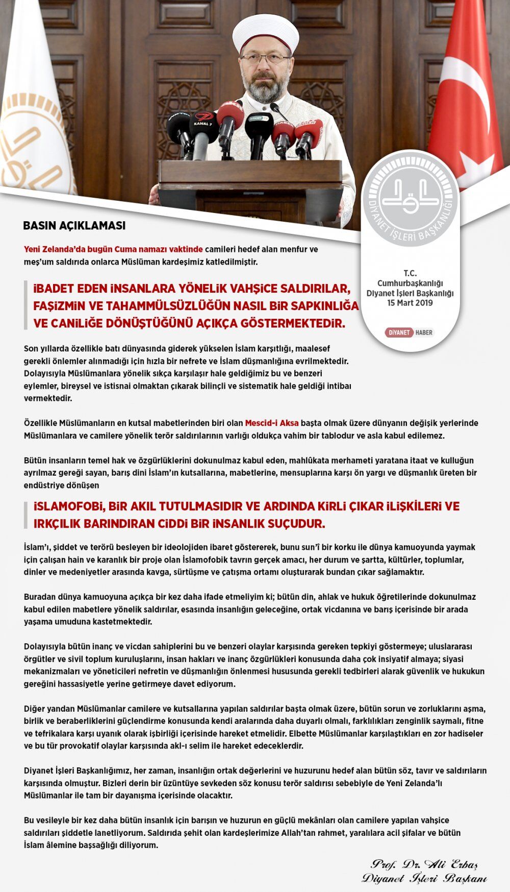 Diyanet İşleri Başkanlığımız, her zaman, insanlığın ortak değerlerini ve huzurunu hedef alan bütün söz, tavır ve saldırıların karşısında olmuştur. Bizleri derin bir üzüntüye sevkeden söz konusu terör saldırısı sebebiyle de Yeni Zelandalı Müslümanlar ile tam bir dayanışma içerisinde olacaktır.