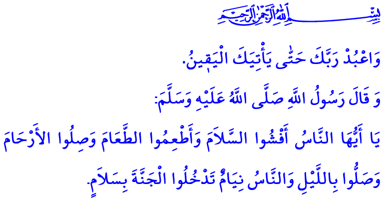 Hutbemi Peygamber Efendimiz (s.a.s)’in şu hadis-i şerifi ile bitiriyorum: “Ey insanlar! Selâmı aranızda yaygınlaştırın, yemek yedirin, akrabalık bağlarınızı gözetin, insanlar uyurken namaz kılın ki selâmetle cennete giresiniz.”[3]
