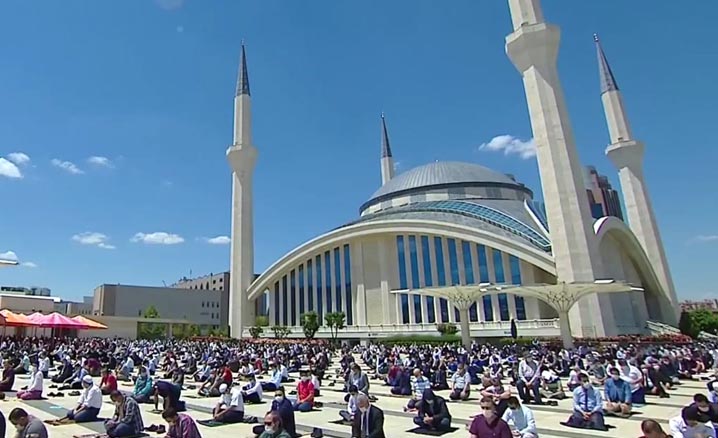 Ankara Kocatepe Camii'nin girişine ise vatandaşların sağlığını korumak için dezenfektan kabini kuruldu. Gelenlere tek kullanımlık seccade, maske ve kolonya veren görevliler, sosyal mesafe kuralına uyulması konusunda da uyarılarda bulundu.