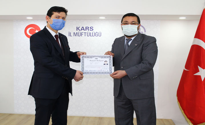 Diyanet İşleri Başkanlığı koordinesinde koronavirüsle mücadelede mesai mefhumu gözetmeksizin vatandaşın hizmetinde olan din görevlileri, Kars Valisi Türker Öksüz tarafından "Başarı Belgesi" ile taltif edildi.