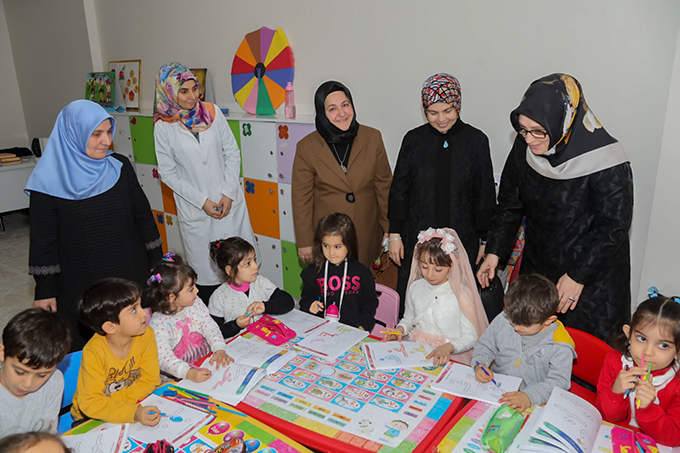 Külliye bünyesinde hizmet veren Gençlik Merkezi’nde yetim aileleriyle bir araya gelen Seher Erbaş, burada ailelerle bir süre sohbet etti.