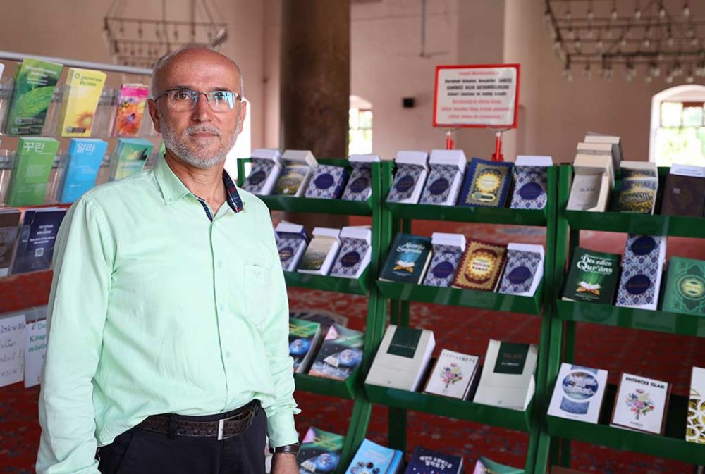 İslamiyeti, diğer dinlere hoşgörüyle bakışını anlatan imam Taşdemir, ziyaretçileri 20 farklı dilde hazırlanmış Kur'an-ı Kerim'lerin yer aldığı standın önüne davet ediyor.