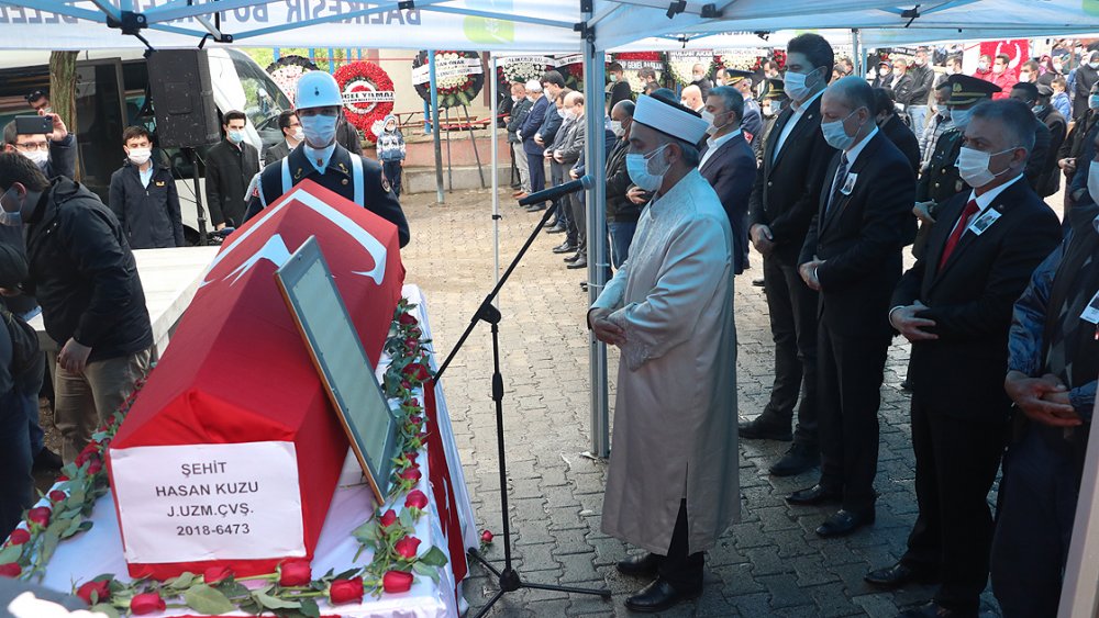 Şehit Jandarma Uzman Çavuş Hasan Kuzu'nun naaşı, katılımcıların aralarında mesafe bırakarak saf tutmasıyla Balıkesir Müftüsü Ramazan Topcan tarafından kıldırılan cenaze namazını müteakip mahalle mezarlığında defnedildi.