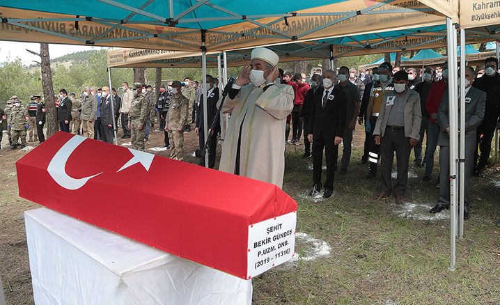 Siirt'in Pervari ilçesinde şehit olan 23 yaşındaki Piyade Uzman Onbaşı Bekir Gündeş'in Necip Fazıl Şehir Hastanesi morgundan alınan Türk bayrağına sarılı naaşı, Kahramanmaraş'ın merkez Onikişubat ilçesi Beşen Mahallesi'ndeki baba ocağına götürüldü.