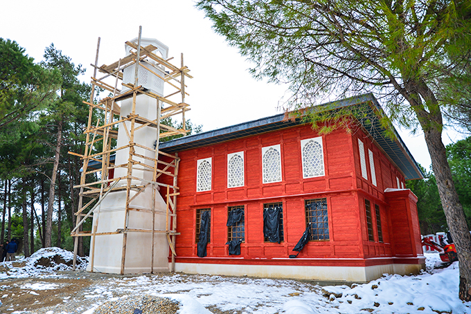 Aynı mevkide bulunan Şehitler Abidesi'nin ismini taşıyacak caminin inşasında 250 metreküp sarı çam ahşabı kullanılıyor. Minaresi Antalya'dan getirilen limra taşından yapılan caminin geri kalan kısmı tamamen ahşap olacak. Caminin dış cephesi, aşı boyasıyla renklendirilecek.