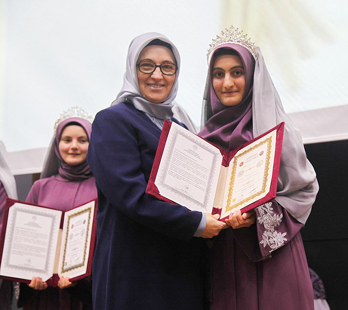 Sonrasında kürsüye davet edilen Diyanet İşleri Başkanı Ali Erbaş’ın eşi Seher Erbaş ise “Hafız olmak ve ölene kadar hafız kalmak çok önemlidir. İnşallah bu genç hafızlarımız da hıfzlarını tutarlar, hafız öğrenciler ve hafız evlatlar yetiştirirler. Hassaten Başkan Bey’in de her birinize selamlarını getirdim.” dedi.