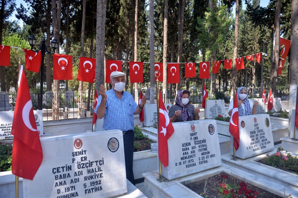 Çevresi Türk bayraklarıyla süslenen Adana Asri Mezarlık Garnizon Şehitliğinde, Kur'an-ı Kerim okundu, dualar edildi. Maske takarak yeni tip koronavirüse (Kovid-19) karşı önlem alan aileler, Türk bayraklarıyla donatılan mezarlardaki çiçekleri suladı.