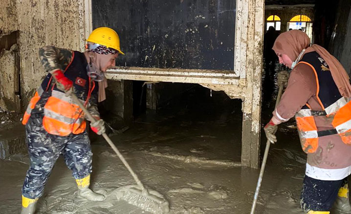 AFAD ve Türk Kızılay gönüllüleriyle askerler tarafından yapılan çalışmalarda, tonlarca çamur ve moloz, cami avlusu dışına taşındı.