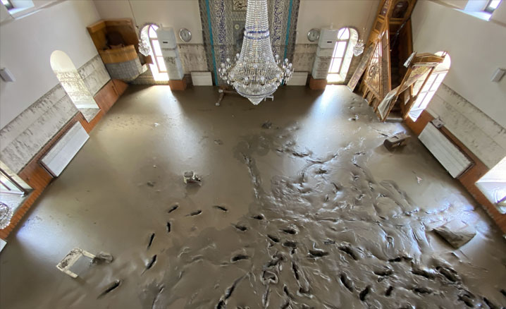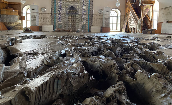 İlçe merkezinde 1908 yılında inşa edildiği belirtilen Merkez Camii'nin içi de yarım metreyi bulan balçıkla kaplandı.