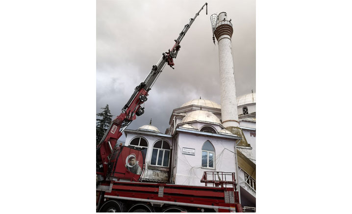 Minarenin yıkılarak tehlike oluşturan külah kısmı, vinç yardımıyla emniyetli bir şekilde yere indirildi.