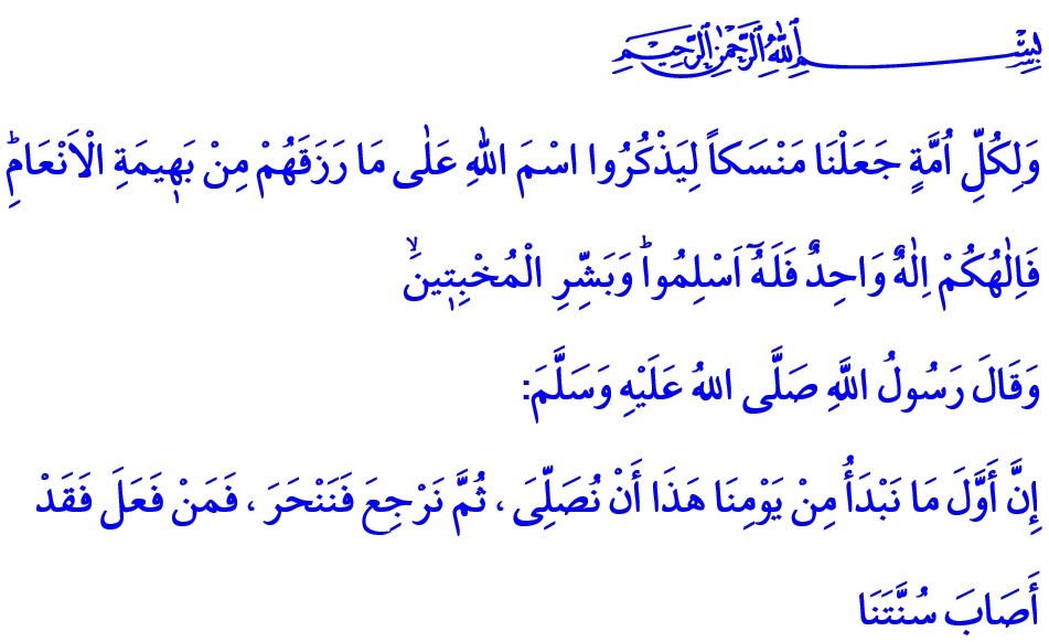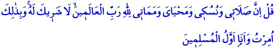 “Şüphesiz benim namazım, kurbanım, hayatım ve ölümüm âlemlerin Rabbi olan Allah içindir. O’nun hiçbir ortağı yoktur. Ben bununla emrolundum ve ben Müslümanların ilkiyim.”[5]